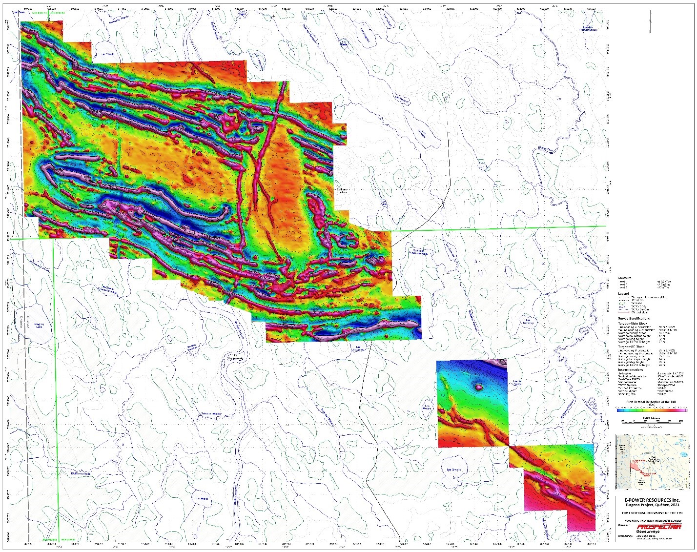 During the fall of 2021, E-Power commissioned an airborne magnetic and time-domain electromagnetic survey.  An example of a processed image is in the map below (first vertical derivative of the total magnetic intensity).  Based on all information available, the Company concludes that the Turgeon property holds limited potential to host an economically viable flake graphite deposit and the Company no longer considers the Turgeon property as a core asset.  The Company has no intention to complete further work on the Turgeon property.