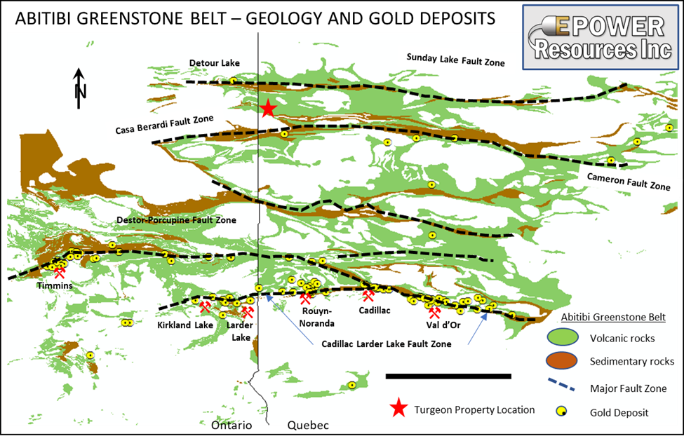 The Turgeon property is located in a geological domain referred to as the Abitibi Greenstone Belt (“AGB”).  The AGB extends in an east-west direction across the Ontario-Quebec border for approximately 500 km and in a north-south direction for a distance of approximately 350 km (see map of Abitibi Greenstone Belt below). The AGB has been, and continues to be, an extremely important mining district for base and precious metals. Historical gold production from the AGB in in excess of 200 million ounces and base metal massive sulphide production totals more than 775 million tonnes.